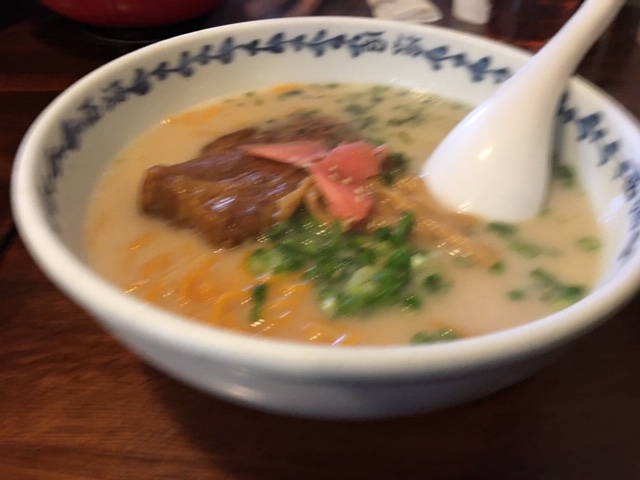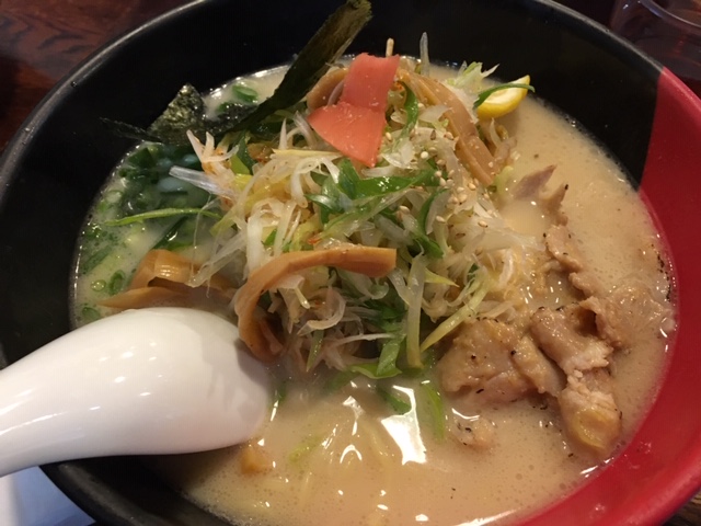 西海と言えば長崎。トビウオの出汁(あご出汁)で取ったスープはあっさりして美味しい。家内と義母はネギラーメン、私は豚トロラーメンでした。
