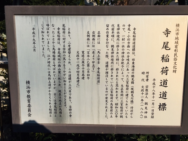 JR鶴見駅の西側に曹洞宗「大本山総持寺」がありますが、その背後にある小高い山が寺尾地区です。こちらに寺尾稲荷が祀られています。現在では、地名が馬場になったことから馬場稲荷と呼ばれていますが、古くは寺尾稲荷と呼ばれており、江戸時代には馬術上達がかなえられる稲荷として有名になり、江戸からの参詣者も多かったといいます。