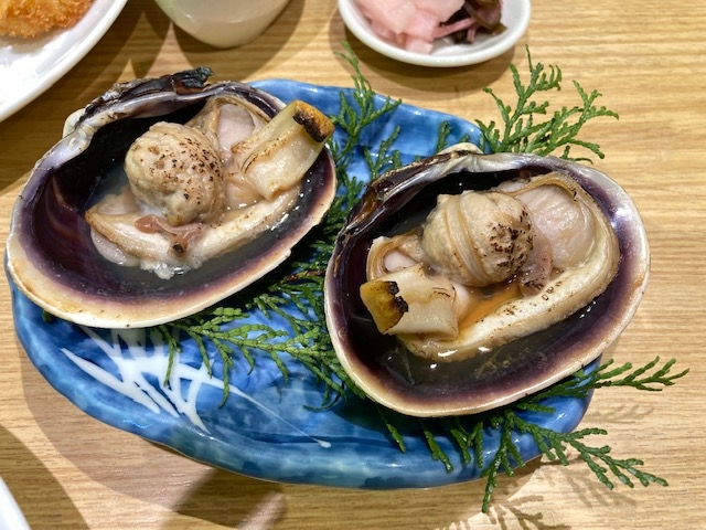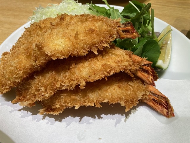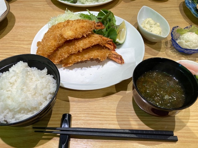 夫婦それぞれ定番のエビフライ定食(2500円、大きなエビフライが3枚付きます)と特別メニューの大あさり(650円)、アオリイカの唐揚げ(500円)を注文して大満足でした。- 旅行時期
