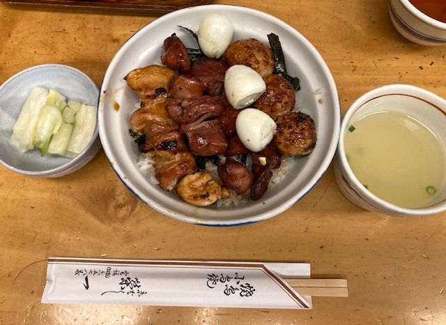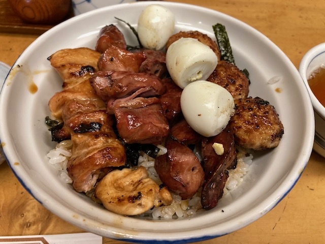 焼鳥丼はお勧めです。正肉、レバー、砂肝、うずらの卵、つくねが並び、「鶏良し、タレ良し、ご飯良し」の圧巻のどんぶりです。これで、1,150円はコスパ良すぎます。- 旅行時期