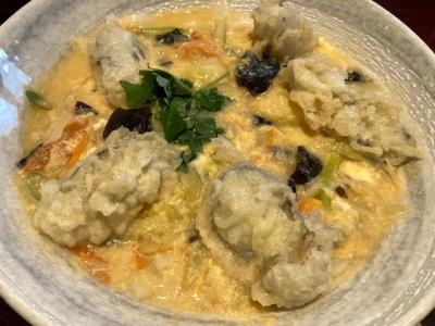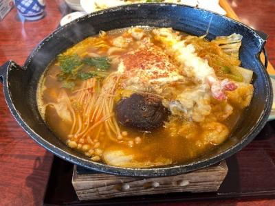 私が注文したのは「旨辛鍋焼きうどん」、家内は「牡蠣玉うどん」でした。味はまずまずです。- 旅行時期