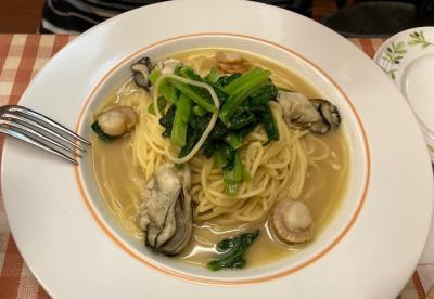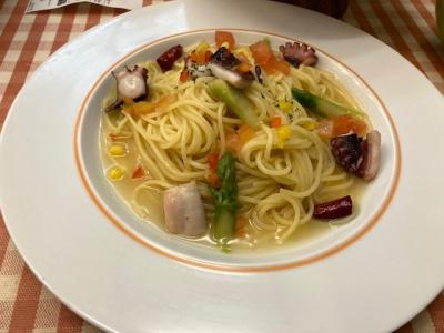 パスタ、サラダ、ドリンクを3点選べるセットがお得です。ドリンクはアルコール類も含みます。私はタコのペペロンチーノ、家内は牡蠣と帆立の和風パスタを選びました。別にピザを一枚追加してお腹一杯でした。- 旅行時期
