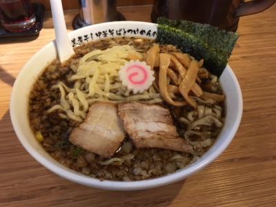 黒煮干しで出汁をとったしょうゆ味のラーメン。麺は平打ちのちぢれ麺です。