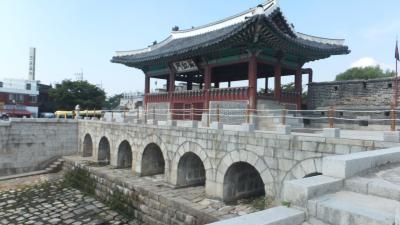 「水原華城」には東西南北に「門楼」4、南北に「水門」が2、「暗門」が5現存していますが、その北水門で、美しい虹門という意味を持つ華紅門と呼ばれます。華城の中心に流れる水原川なかかる美しい石橋で、その上に樓閣が設置されています。