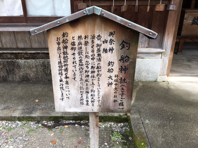 案内板に寄ると、「昔、御畳瀬浦の船が釣りをしているとキスゴの漁が多く、その中に御神体が上がり、釣船大明神とお祭りしたところたちまち御神威を発揮され、古来熱病退散 の霊験あらたかであり熱切りの神様と信仰せられています」。