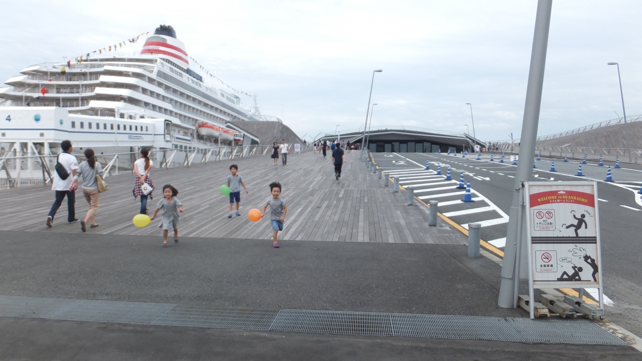 たまたま豪華客船「飛鳥?」が停泊中でした。ただのんびりするだけでも楽しいスポットです。