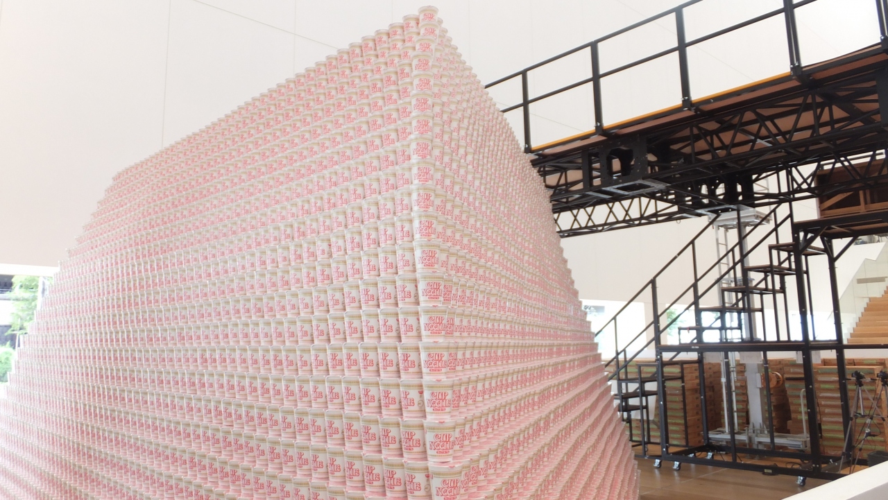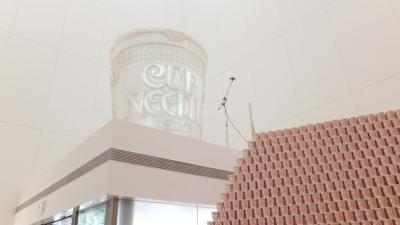 1Fロビーでは「目指せ ギネス世界記録挑戦!」ということで、約57,000個のカップヌードルを使用した、高さ7.4mのピラミッド積み上げに挑戦中でした。