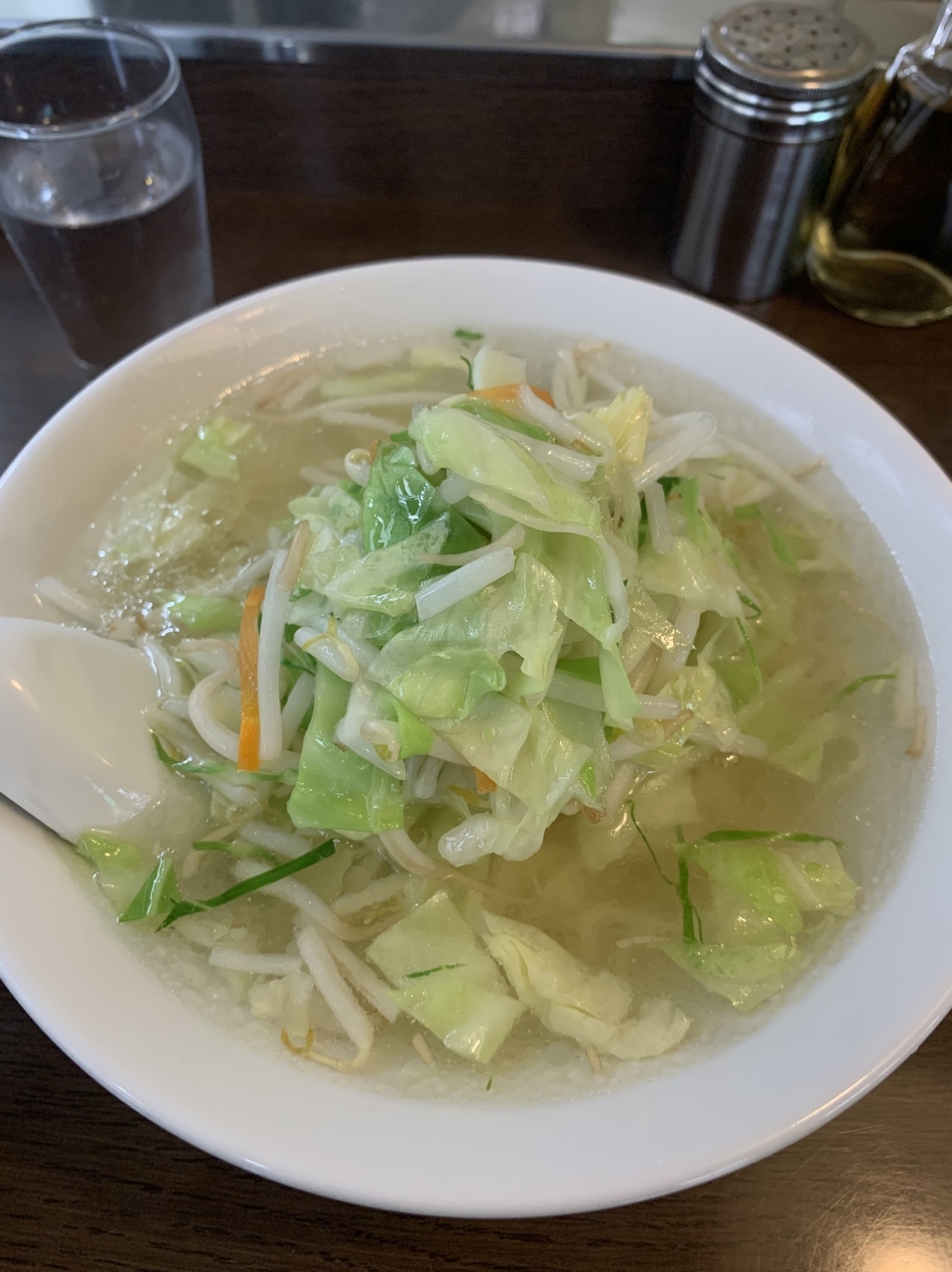 さて着丼。透き通ったスープに刻み野菜がたくさん乗ったタンメン!一口すすると、体に沁みるやさしい味が口の中に広がります。ちょっと化学調味料的な味もするけれど真相は不明。麺もこのスープによく合って美味しい。