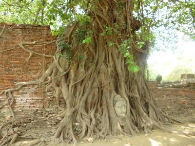 菩提樹の根に囲まれた仏塔のあるワット・マハタート。仏頭の位置が年々上が...