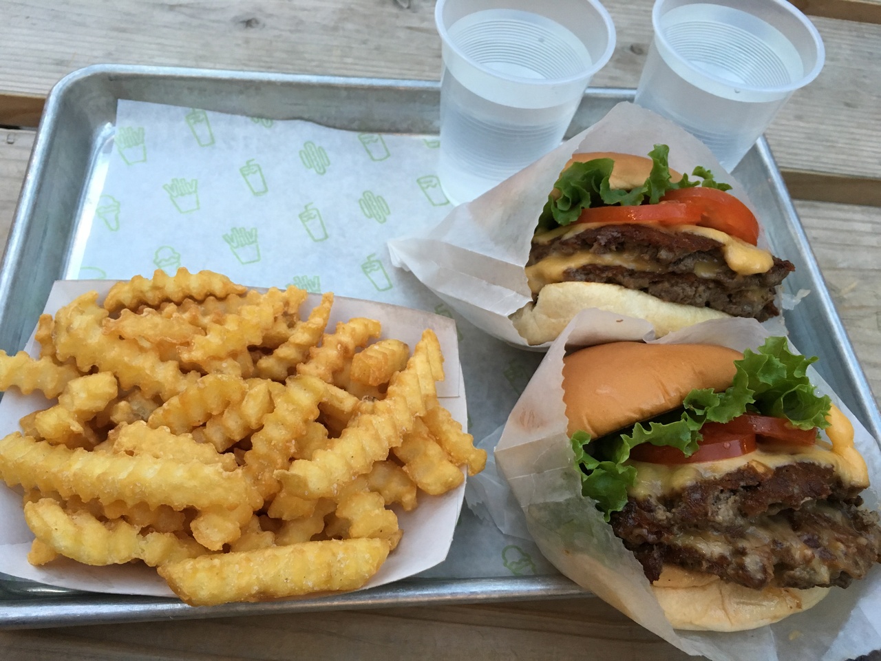 バーガーはシングルのシャックバーガーとレギュラーのポテト。バーガーは1つ700円弱で、ポテトは420円。 味は厚切りのお肉にトマト、レタス、チーズとシンプル。ただ値段の割にボリュームは少なく、あまりお腹にたまらない。