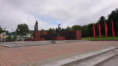 旧樺太神社跡地である栄光広場は、ソビエト連邦感満載の広場です。敷地内には戦争慰霊碑と赤い旗がはためいており、赤い煉瓦の広場が広がっています。広場では地元のロシア人の子供達が遊んでいました。