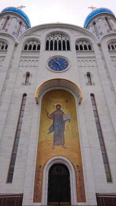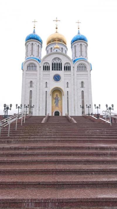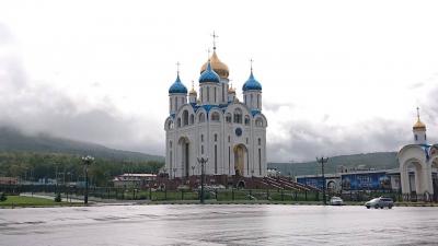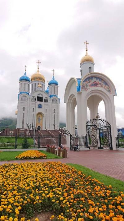 ロシア正教会は、ユジノサハリンスク東部の山の空気展望台のある旭ヶ丘の山の手前にあります。メイン通りの坂を登ったところに位置しており、勝利広場と博物館の横に立ち並んでおります。見た目は実に大きく豪華な建物です。正面で記念撮影をしながら、中に入ってみると大勢の人がお祈りをしている最中でした。内部は上部まで黄金に輝き、実に素晴らしいものでした。