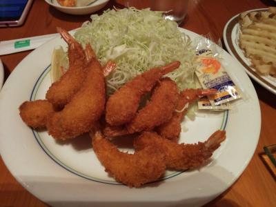 山盛エビフライととんてきとピザをいただきました。