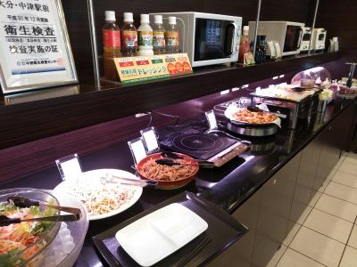 中津駅の西口の歩いて5分とかからないまさに駅前にあるビジネスホテルです。付近はビジネスホテルが多いですが、若干古めの建物が多い中、チェーン店でもあり、きれいな施設で安心です。