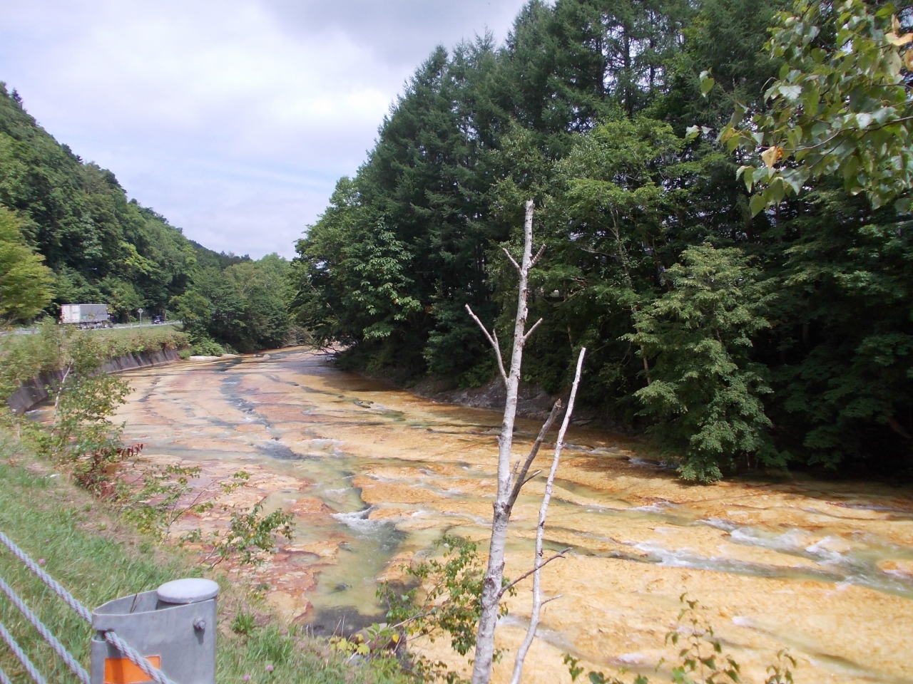 北湯沢温泉に沿って流れる長流川の川床は、白から黄色の川床になっており、