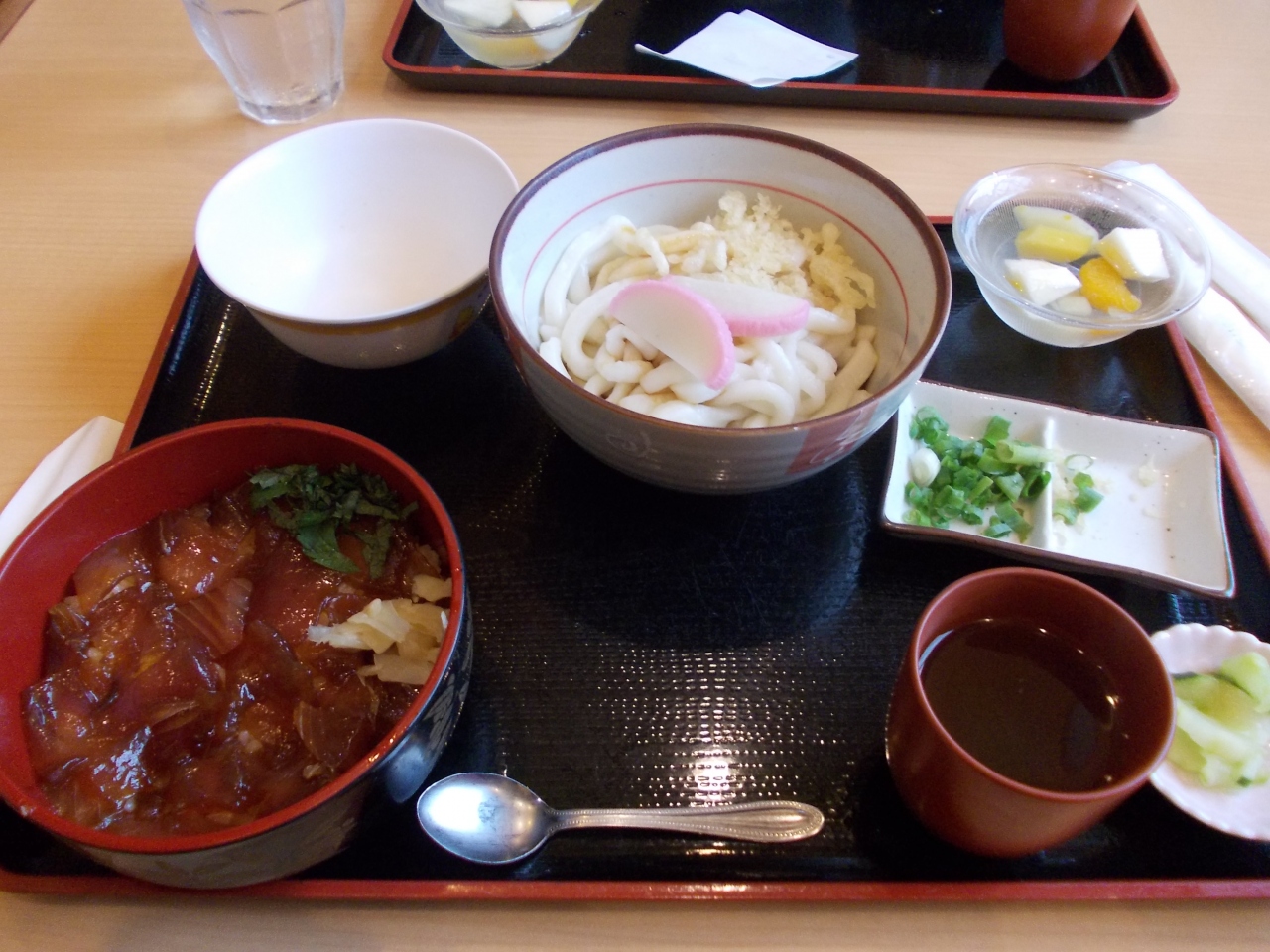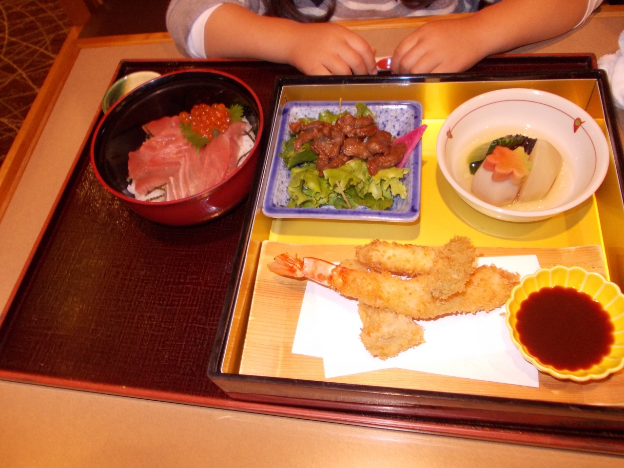 1030円で、まぐろといくら丼、エビフライもあるフライ盛、お肉を焼いたもの、野菜の煮物と、これはお得!当然おいしいです。- 旅行時期