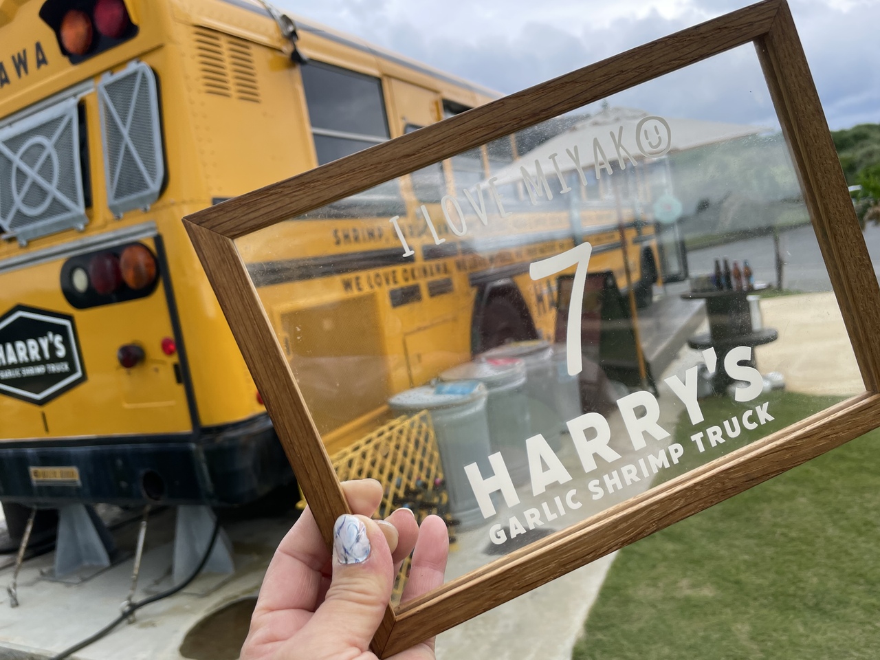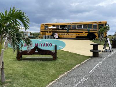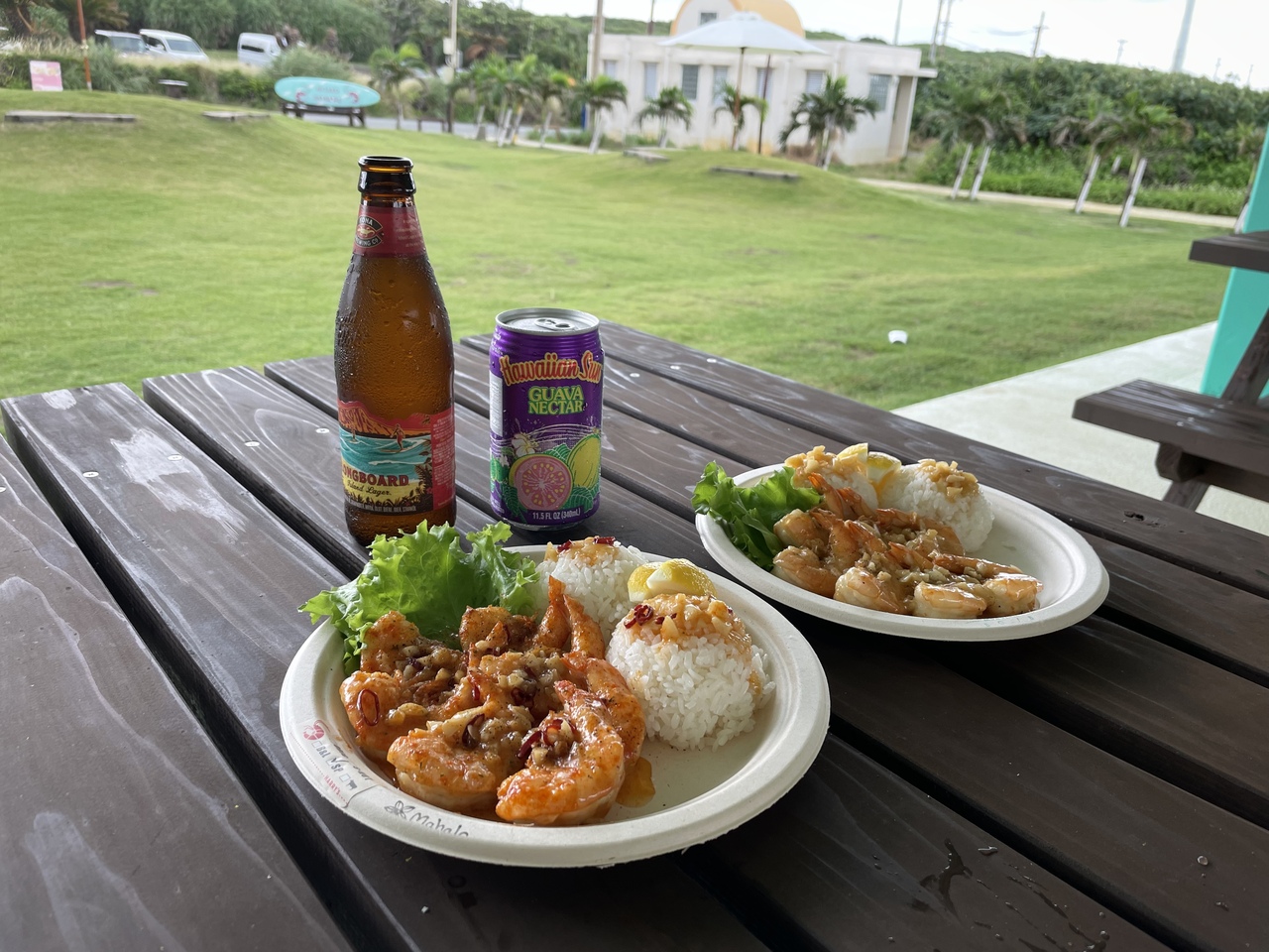西平安名崎展望台前にある、黄色いスクールバスが目印のハリーズ・ガーリックシュリンプ・トラック。バターガーリックとピリ辛のスペシャルをいただきました。一度揚げてあるので、尻尾まで食べられます。飲み物もコナビールやハワイアンサンのジュースまでありハワイ気分にさせてくれます。久しぶりにプリプリの美味しいガーリックシュリンプを堪能しました。