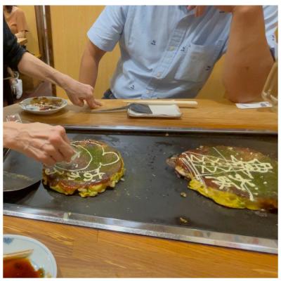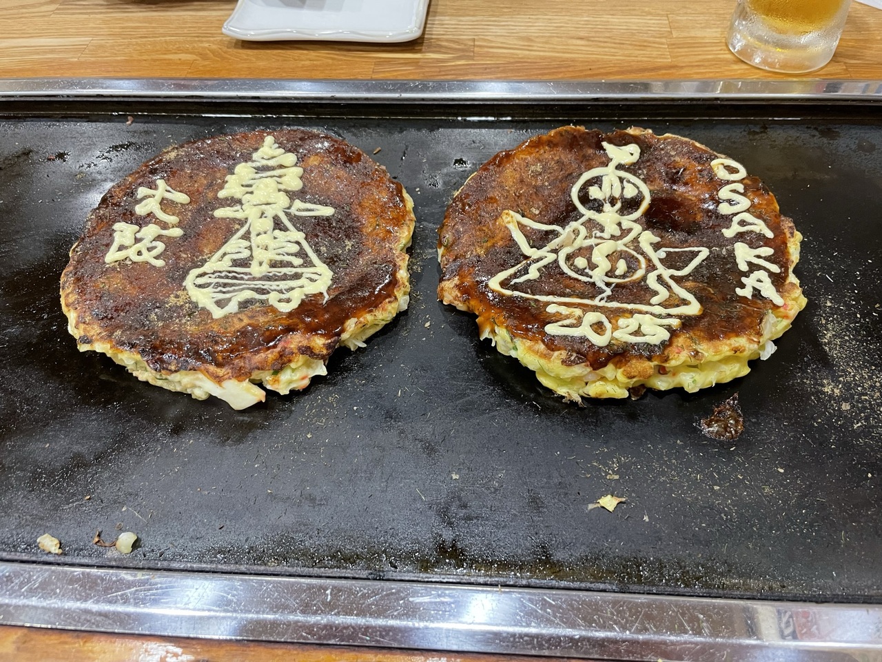 大阪旅行で20年振りに訪問した、お好み焼きおかる。ここのお好み焼きは他店と違い、蓋をして蒸し焼きにするので、ふっくらと美味しいお好み焼きがいただけます。焼き上がったお好み焼きにマヨネーズで絵を描いてくれるのて目でも楽しめます。