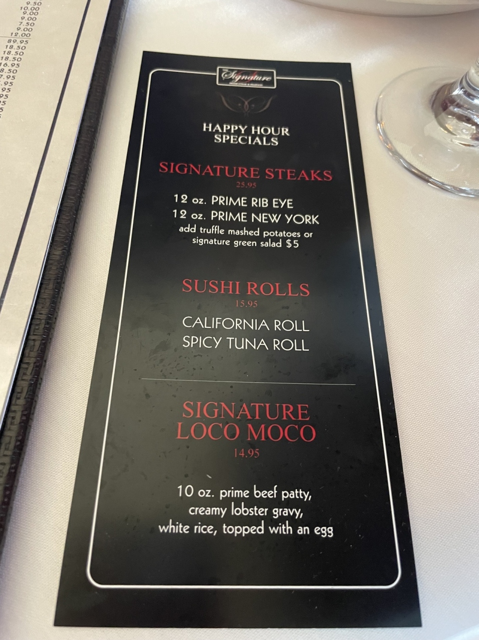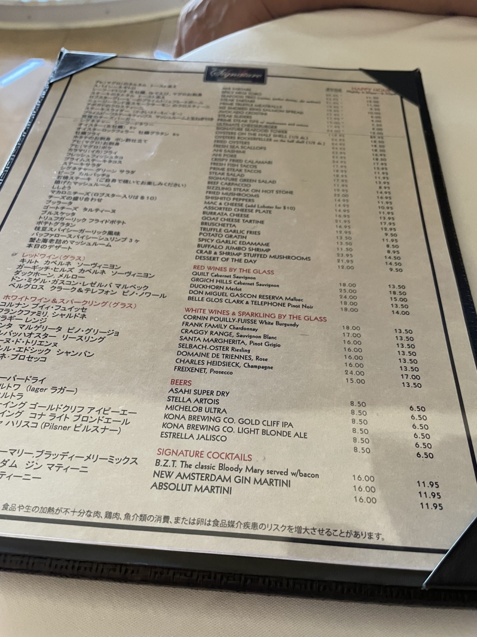滞在中にハッピーアワー(16:30~18:30)で利用しました。1階にはレストランへの専用エレベーターがあり、オープン間際にはレストラン利用のお客さんで列が出来る様ですが、宿泊客は他のエレベーターを利用出来るので並ぶ事なく入店出来ました。ハッピーアワー利用ではカウンターや入り口付近の席となりますが、36階からの眺望は素晴らしいです。お目当ての12ozのプライムリブアイステーキは柔らかく間違いない美味しさでした。- 旅行時期