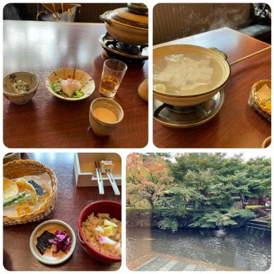 石門をくぐると素敵な日本庭園が広がり、純和風の佇まいの涼庭閣で熱々の湯豆腐・田楽・天ぷら・湯葉など美味しい湯豆腐懐石を頂きました。