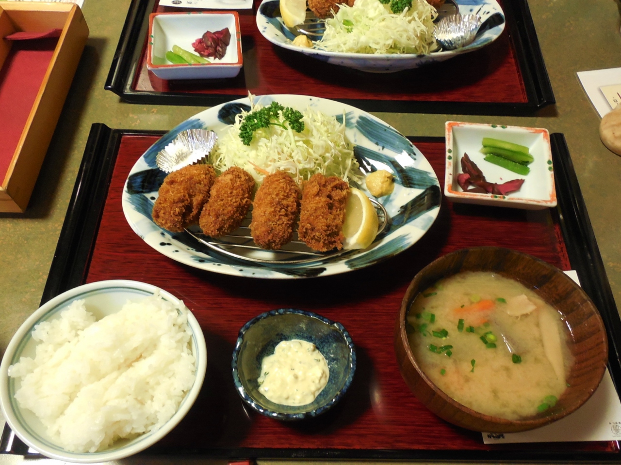 席につくと、小さなすり鉢にはいったごまが出てきます。待っている間にこれを摺って、すりごまにして食べるときにかけるのですね。オリジナルのドレッシングも満足のいく味。そしてなんといっても冬場は牡蠣フライ定食。おいしいですよ~- 旅行時期