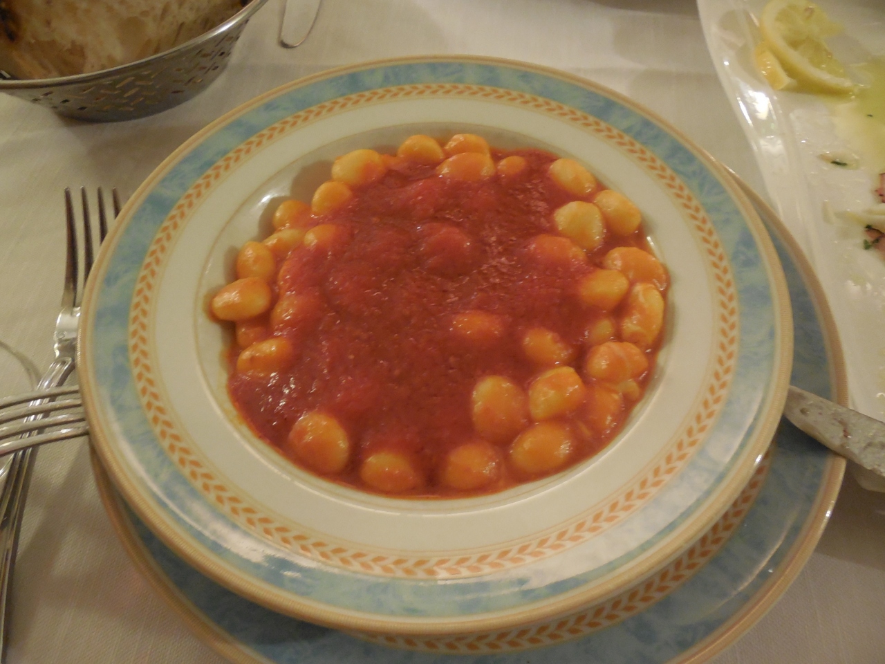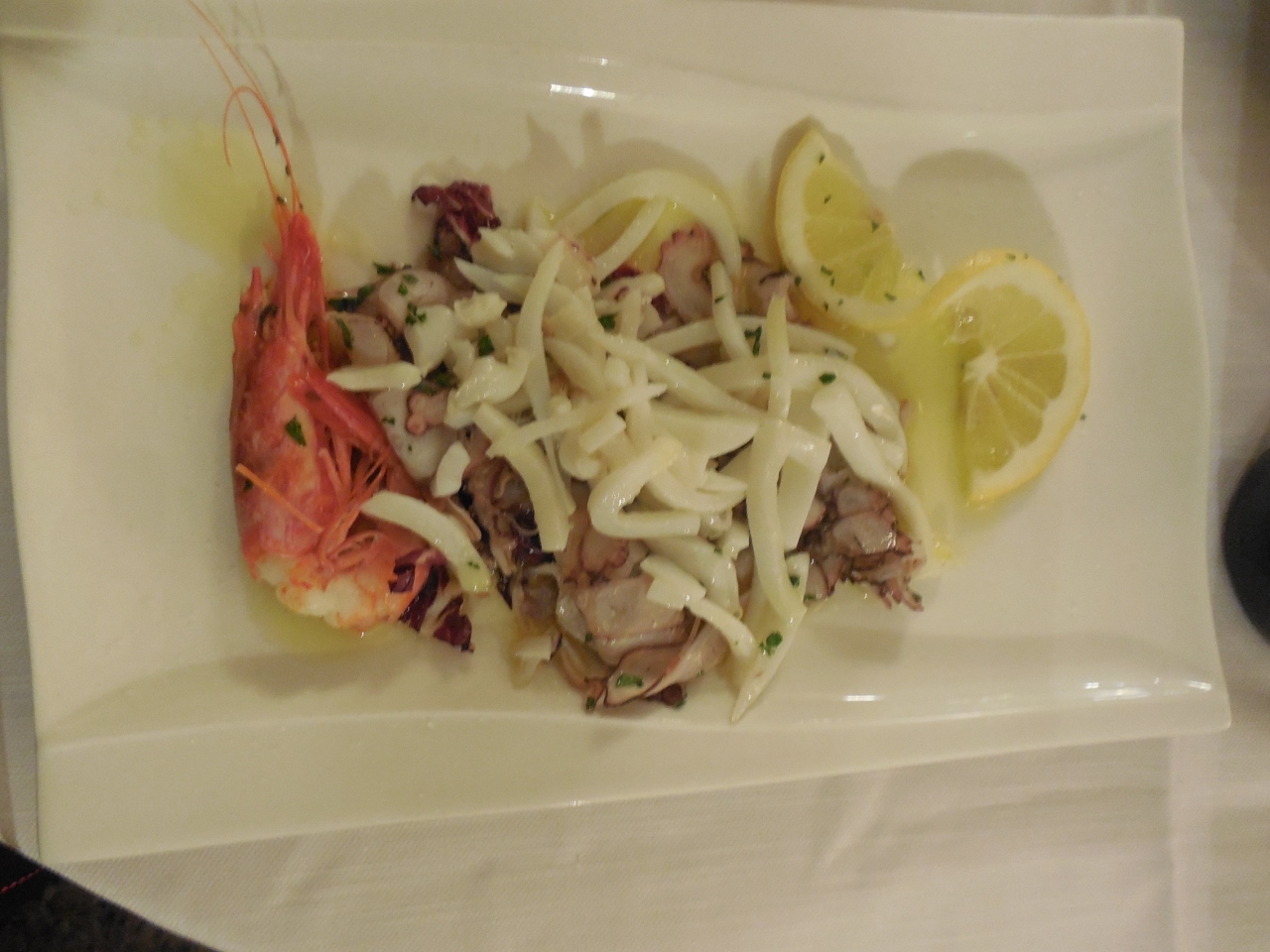 イカやエビの前菜に、トマトソース味のニョッキ、ナポリの野菜など郷土の料理が楽しめました。