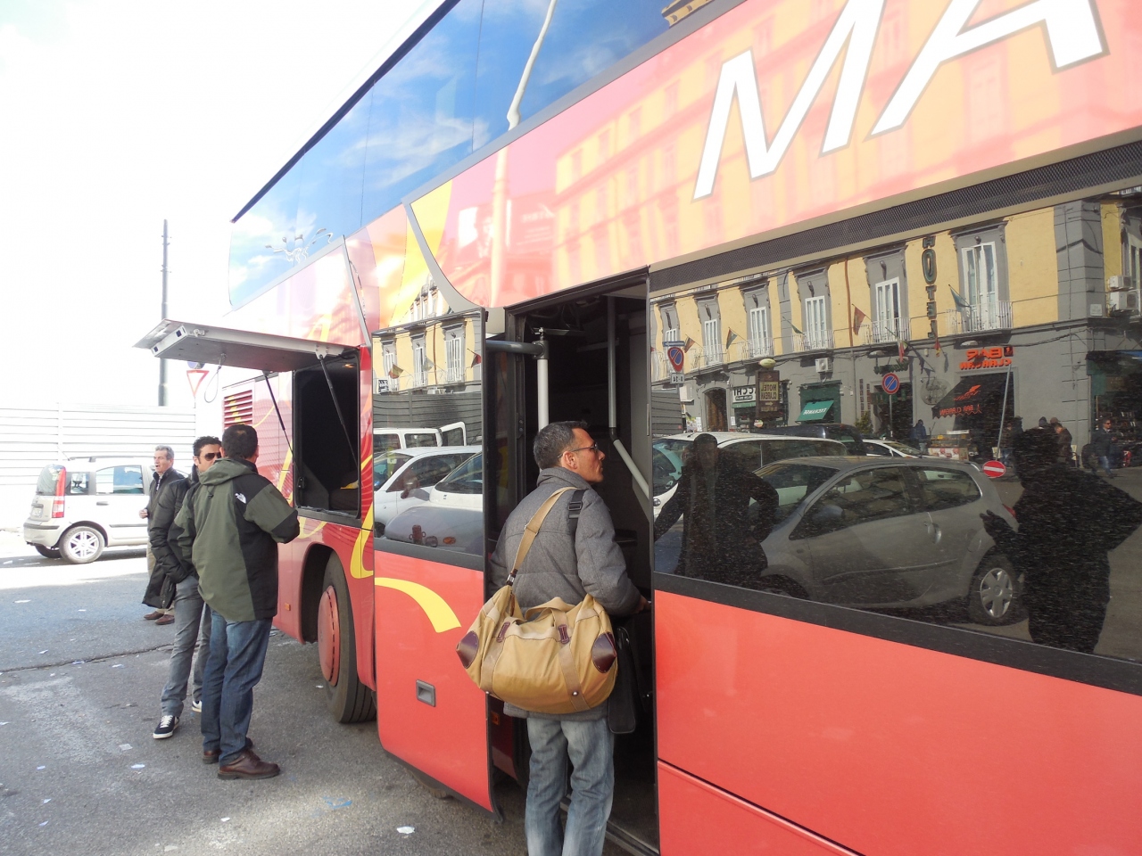 私達が乗ったバスは赤っぽい色の2階建バスで、荷物を入れる場所が高いところにあったのでスーツ・ケースを持ち上げるのがちょっと大変でした。車種は色々あるようで、発着場所を下見に行ったときは青い車体のバスも見かけました(バーリ行きではないかもしれないですが)