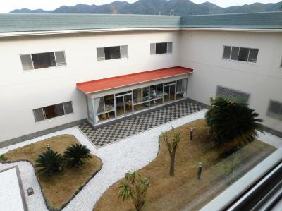 最上階の大浴場とそのすぐ下の階の客室からは海が見えるのですが、それより低い階は、敷地内の防風林が窓からの景色となるようです。