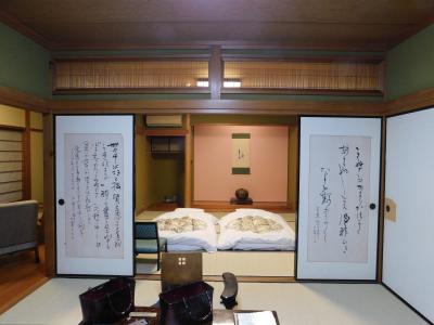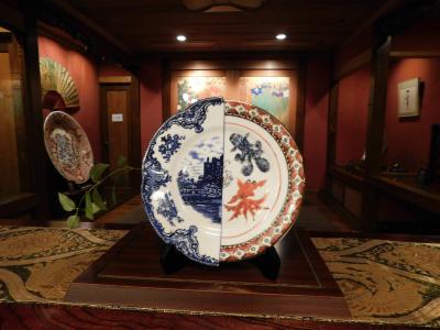 部屋は広い続き部屋で、調度品も和と洋が合わさった良いセンスのもので癒されました。宿のあちこちに見るべきところがあります。広重の美しい版画が飾られている「花鳥風月の廊下」や、大きな皿が飾られたロビーなど、是非お宿の中を散策してみてください。池には金魚のようにひらひらとした白い鯉が泳いでいます。