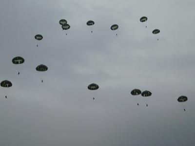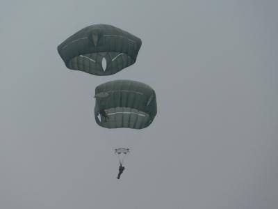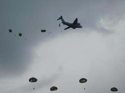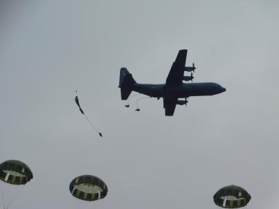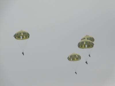 陸上自衛隊 第一空挺団の降下訓練初め。習志野駐屯地ではなく、そこから少し歩いたところにある習志野演習場で行われます。演習場の門から少し歩いたところに「一般の見学席まで1900メートル」と書いた立て看板があってぶっとびそうになりました。そこから少し行くとシャトルバスの発着所があって結構人が並んでました。さすがにだだっ広いですね。私達はてくてくと見学場所まで歩いて行きましたが、歩くと結構時間がかかり、、結局見学場所に着いたのは始まる時間ぎりぎりで、既に人でいっぱいでした。