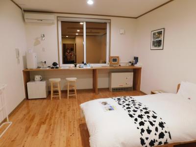 大自然の中にぽんっという感じであるペンション。床の無垢材がとても足に気持ちよく、リラックスできました。残念ながら雨だったので星空は見えなかったのですが、北海道の美味しいごはんに大きな2匹の猫。黒い猫はくまちゃん。サビ柄はキキちゃん。夕食後にナデナデさせていただきました。