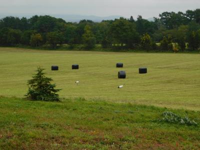 部屋の窓から見える景色は最高で、ちょうど牧草を刈り取るシーズンで、黄緑色の上に黒い牧草ロールがてんてんと置かれている景色は美術館の庭のように美しかったです。