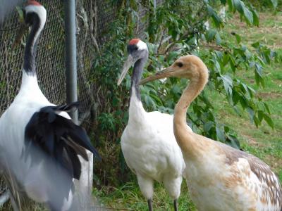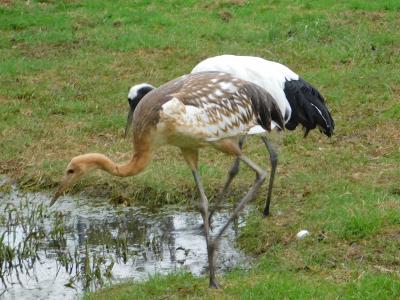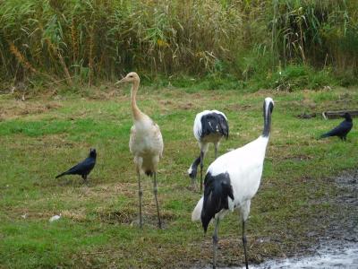 一応金網で囲まれていますが、ケージという感じはあまりしなく、自然になるべく近い形で見られるよう、金網はとても広く、中には小さいながら小川があるブースもありました。上には網はなく空いてるので、エサ目当てのカラスがたくさん鶴のそばにいました(笑)7月にヒナが生まれたそうなのですが、3か月経つと大きさはほぼ大人に近く、羽根や体が茶色なので、あれが今年のヒナね~、という感じでした。
