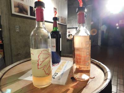 ワイナリー巡りの初日に寄りました。コロナ禍で工場見学はできなかったのですが、建物の外で試飲をさせていただきました。椅子代わりのワインケースに腰を下ろして4人で試飲させていただきました。コロナでなければーーと思いつつ、隣に併設されている売店に入って見たらこちらは試飲のワインや葡萄ジュースがずらりと並んでいました。壁に試飲用の蛇口があって、その横にワインボトルが置かれていました。先にこちらから見ればよかった~と笑いました。