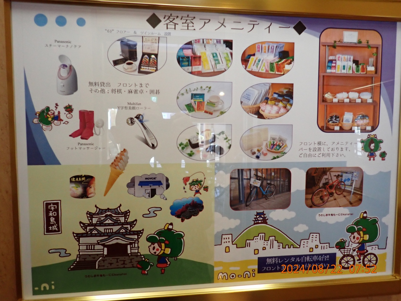 宇和島観光で利用しました。ロケーションは駅直結なので非常に便利でした。市内の主な観光地は歩いて行ける距離なので、観光は専ら徒歩で可能でした。アメニティーはアメニティバー方式で、2階のフロント横にあるものを利用するスタイルでした。毎日のミネラル水もフロント横の冷蔵庫または棚から取り出すスタイルで、好みで冷えたものと常温のモノを選べる便利な方式でした。コーヒーマシンもあり、パックもアメニティバーから自由に利用出来ます。バスルームもトイレの前が広く使い易かったです。一点だけ、困ったのは、枕が2つとも非常に臭かったので、交換してもらったのですが、素材の関係なのか私的には非常に残念でした。
