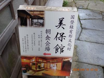 美保関観光で利用しました。美保関までは、隠岐島前西の島からカーフェリーで境港まで行き、境港駅前からバス2本乗り継いで着きました。2本目のバスの終点から旅館までは数分で歩ける距離で楽でした。美保館の宿泊施設は複数ありましたが、本館の窓際にソファーがある和室に宿泊しました。夕食は宿泊した本館で、朝食は国文化財の建物でした。朝食後、国文化財の建物内を見学できました。