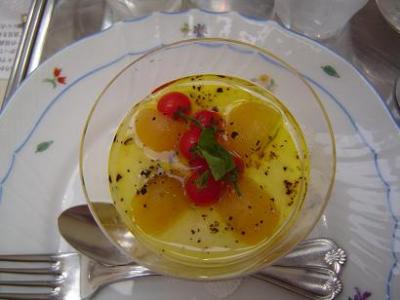 ブランマンジェには千切りのフレッシュバジル、上に乗ってる黄色と赤い実はトマト、黒い粒粒は胡椒なんです、そして、ソースは実はオリーブオイル!