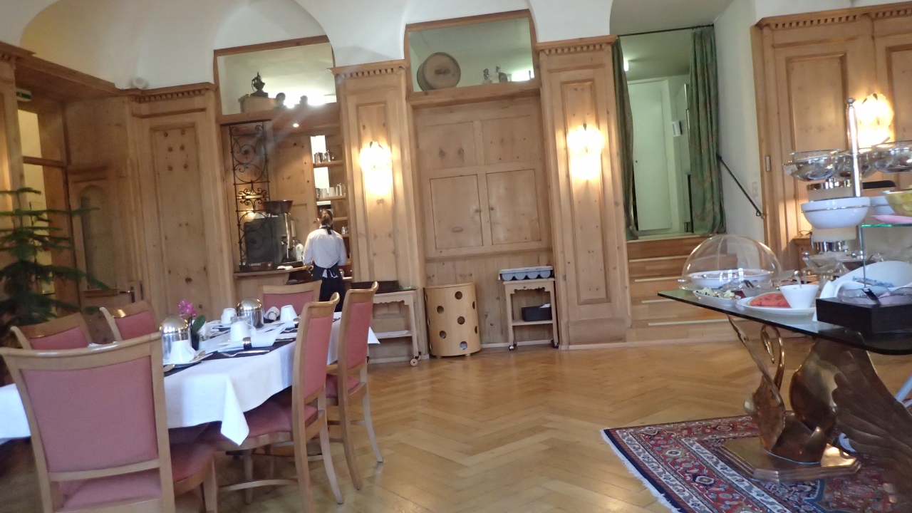 サンモリッツ駅からはベンツの送迎をお願いできます。2泊以上すると、レセプションで周辺の交通機関が無料になるエンガディンカードを貸してもらえます。レイクビューの部屋からは素晴らしい眺めを楽しめました。レセプション脇の部屋に水、牛乳、お茶、コーヒーなどがあり無料です。お酒等は有料で自己申告制。「Honest Bar」と呼んでいました。朝食の部屋は木目調で落ち着いていて、内容も良かったです。従業員もよく訓練されている感じで、気持ちよかったです。