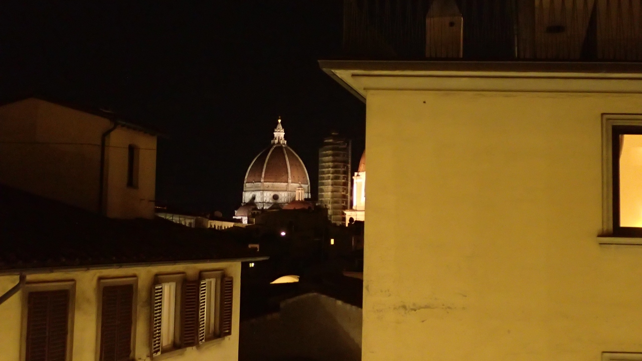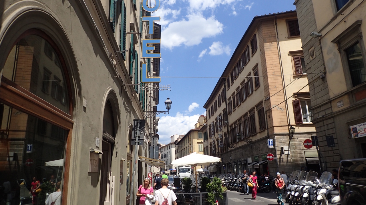フィレンツェ・サンタ・マリア・ノッヴェッラ駅から歩いてスグです。近くに中央市場があり、美味しいものがふんだんにあって食事には困りません。405号室からだけクーポラが見えますので、この部屋に当たればラッキー。レセプションにも客を歓迎する言葉が書かれていて、好感度高いです。