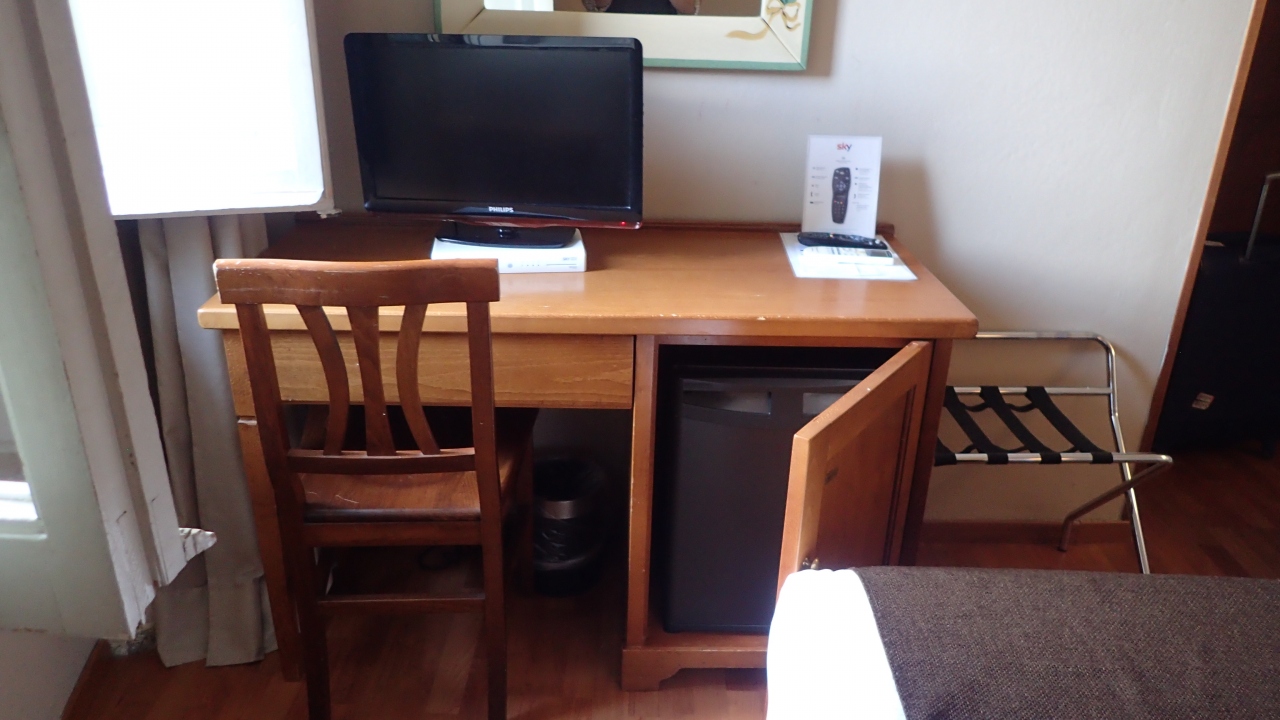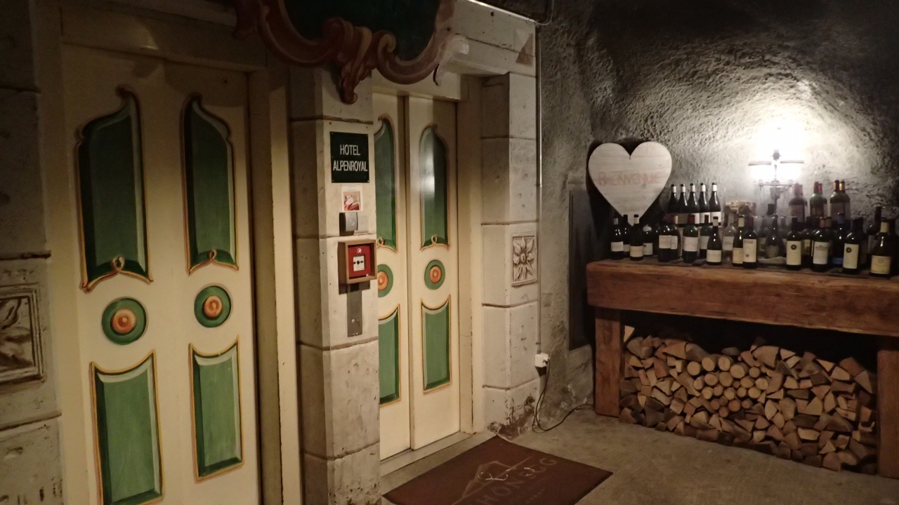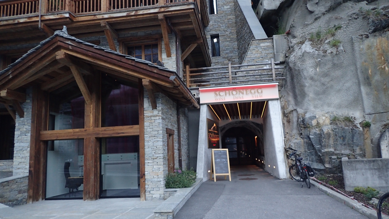 駅から離れた高台の斜面にあるため、上り坂を歩いて行くのが大変です。しかし宿泊者だけが使えるエレベーターがあり、レセプションでカードキーを渡されます。これを使えば駅までは6分くらい。さすがに部屋およびテラスからのマッターホルンの眺めは良いですが、マッターホルンは南側に見えるため夏の日中は日射しがきびしく結局カーテンを閉めてしまいました。デラックスダブルルームに冷蔵庫はなく、コスパは悪いと判断します。