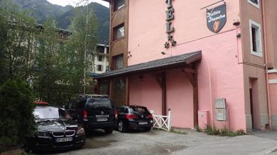 レンタカーで行きましたので、無料駐車場のあるところを選びました。駐車場はホテルの横の空き地で3台停まれるようです。フロントの人も親切で、ホテルとしては問題ないように思います。エギュイユ・デュ・ミディへのロープウェイの駅までは徒歩で7,8分か。