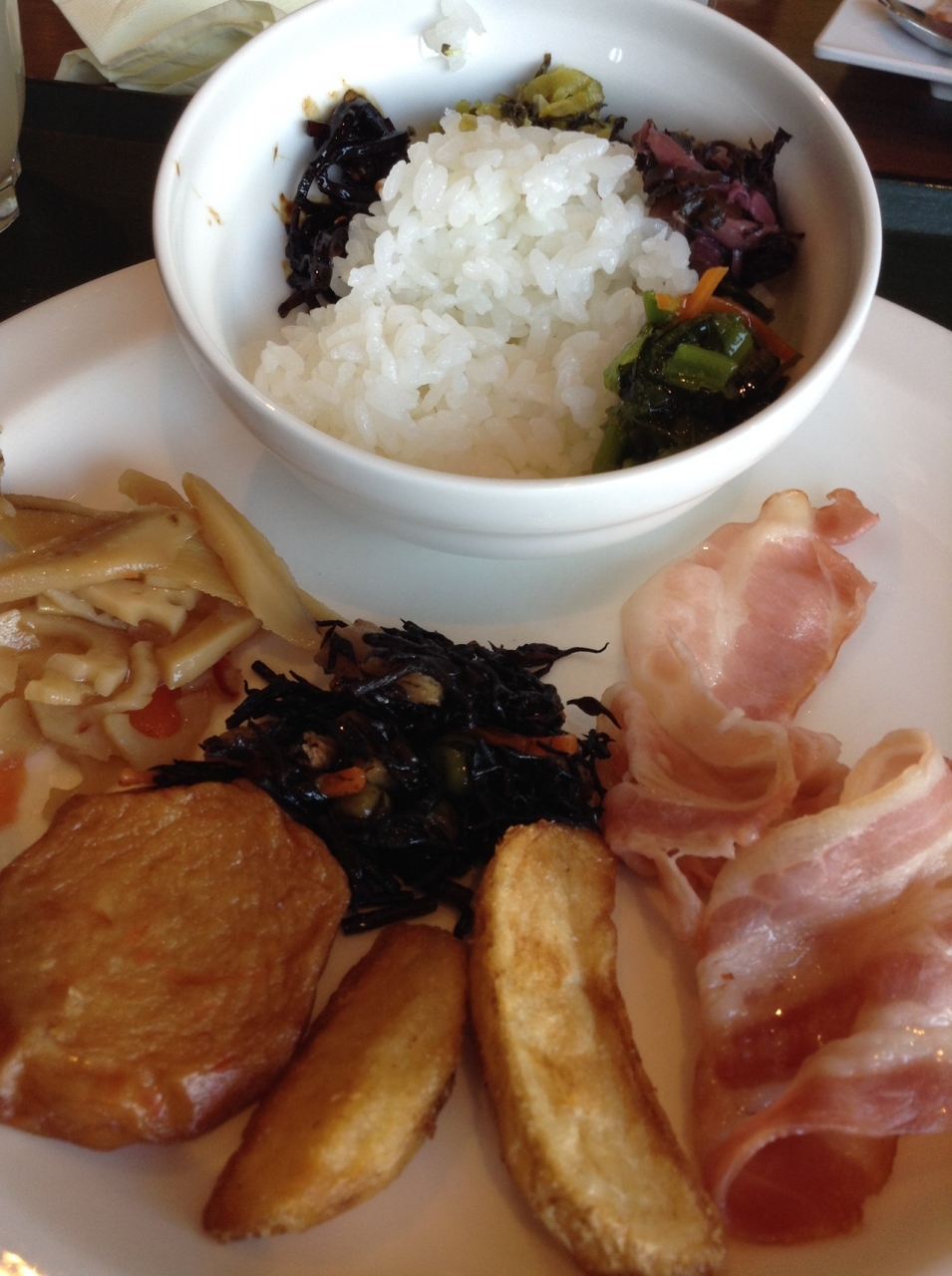 朝食には、定番のウインナー、卵料理、ポテト、サラダの他にきんぴら、ひじき、そばがありました。パンは4種類程、シリアルなどもありました。