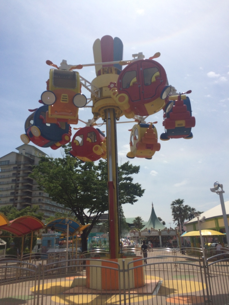 三重県桑名市にあるナガシマスパーランド。そのキッズタウンにある乗り物です。ヘリコプターに乗って、高く上がって、クルクル回る乗り物です。
