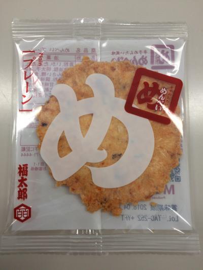 めんべいは、めんたいこのおせんべい。ぴりっとした辛みがきいたおせんべいなので、辛いのが苦手な人や子供は食べれないかもしれません。