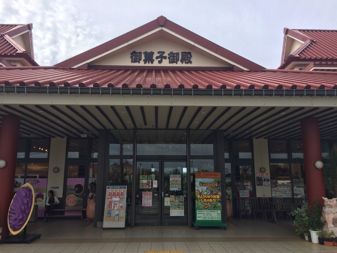 沖縄を代表とするお土産、『紅いもタルト』。紅いもタルトを売っているお店が御菓子御殿です。沖縄県内に数店舗展開していますが、この名護店は子連れにオススメ。
