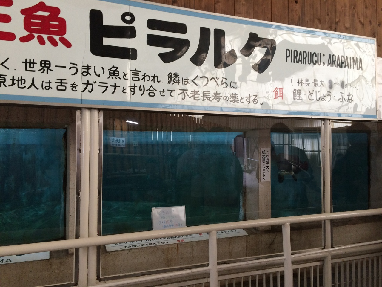 熱帯魚といっても、カラフルな魚は1匹もいなくて、ピラニアやピラルクがいるという感じです。施設も古いので、地味な印象になりがちかな。