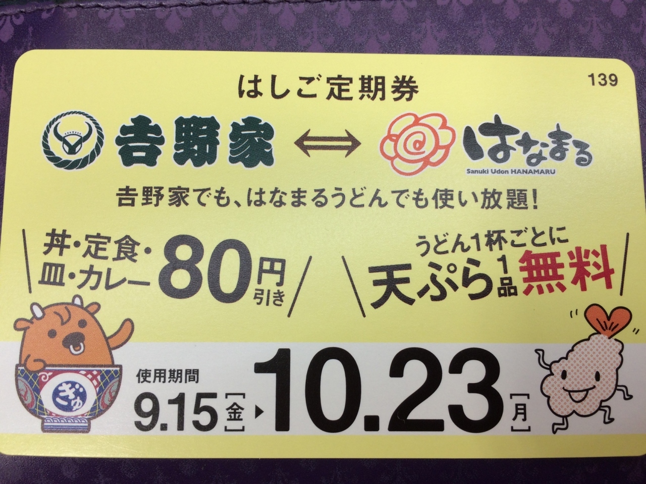 今回、吉野家とはなまるうどんで使えるはしご定期券を買いました。