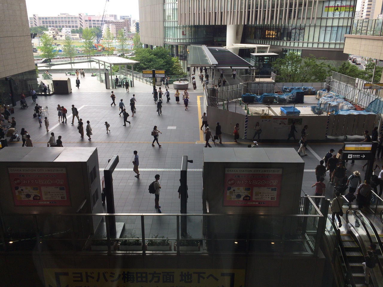 JR大阪駅のノースゲートビルディング2階にある広場です。目の前にはルクアがあって、グランフロント大阪に通じる連絡橋がある場所なので、とにかく人が行きかっています。