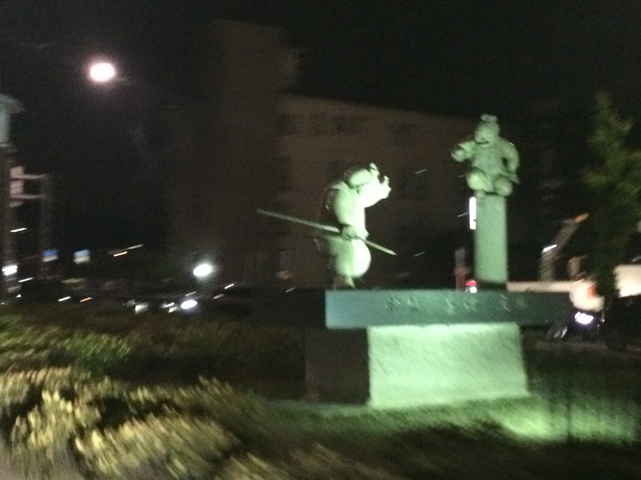 京都の五条大橋にあるモニュメント、『弁慶と牛若丸』。国道一号線沿いの中央分離帯付近にあるので、見つけやすいです。