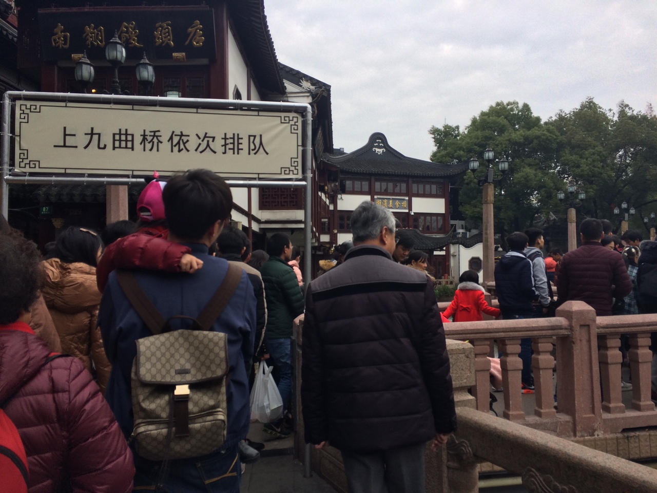 元旦の日に行ったので、九曲橋も混んでいて、柵がたくさんあって、ちゃんと並んでしか歩いて行けないようになっていました。立ち止まる人も多い為か、橋の曲がり角全部に警備員がいて、立ち止まると進むように言われます。